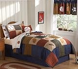 Classic printed plaids with denim and clay accent colors in a hand crafted sports themed quilt. Embroidered appliqués to show off your favorite team sport! The set includes: 1- Twin Size Quilt, 1- Pillow Sham, 1- Pillowcase, 1- Flat Sheet & 1- Fitted Sheet. The sheets feature embroidered sports balls on the hemline of the flat sheet and pillowcase.
